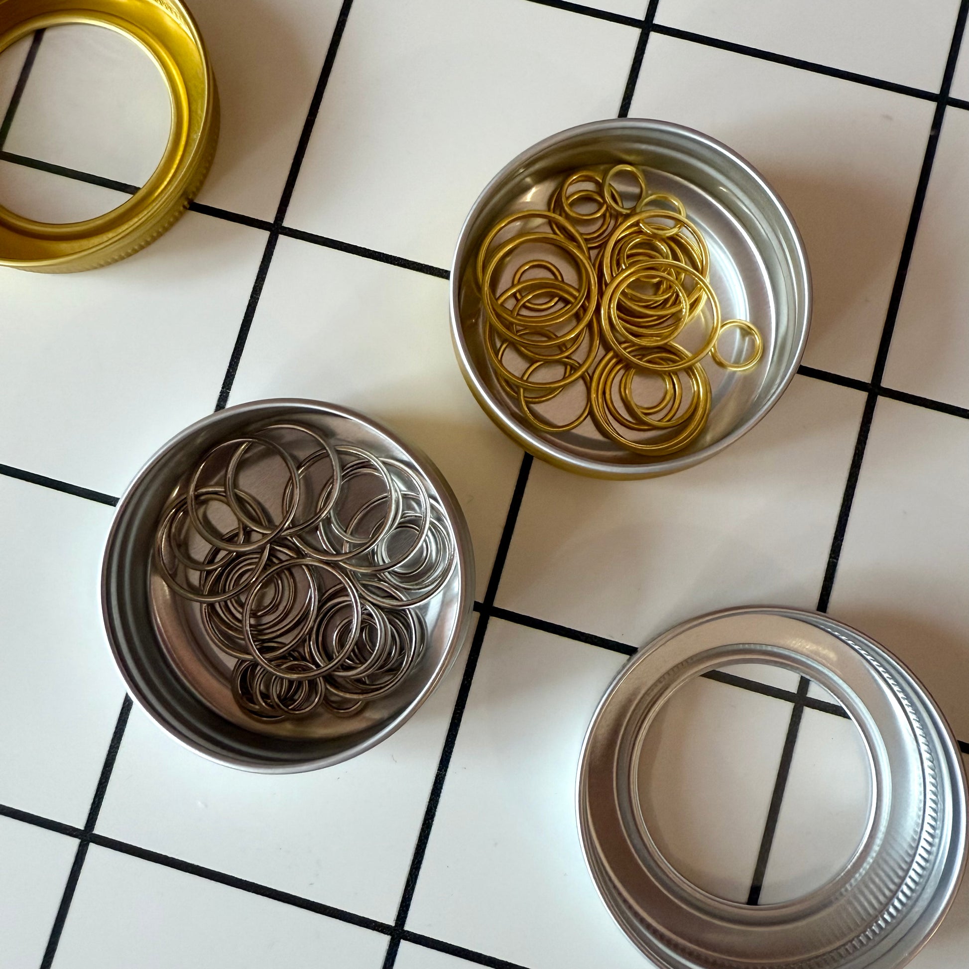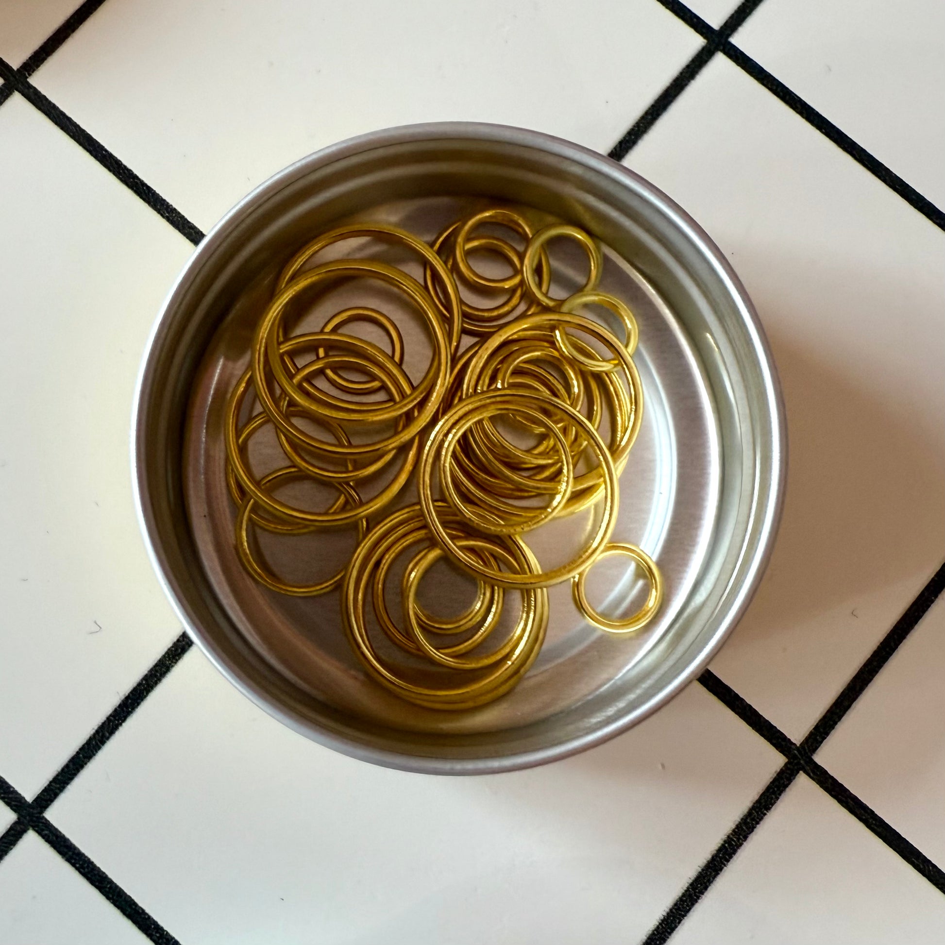 Keep your stitch markers safe in one of our mini tins, available in gold or silver colours. These cute simple metal stitch markers are ideal for keeping track of your rows and stitches, marking a specific point in your knitting or crochet project and they are super easy to use too.